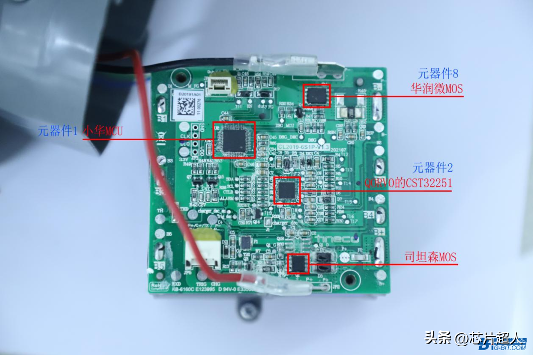 在电池的电路板上,则搭载了小华的32位MCU、Qorvo的电源应用控制器CST32251、华润微的MOS产品CRTM030N04以及司坦森的mos等电子元器件。