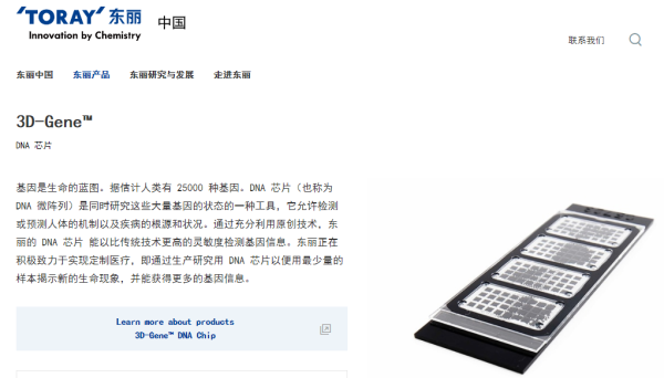 根据外媒相关报道,东丽公司拥有基因芯片技术,并且不断的提高其核酸基因检测的灵敏度,该公司制成的基因芯片在探测miRNA、mRNA和其他生物标志物方面性能也得到了欧洲研究人员的验证和肯定。