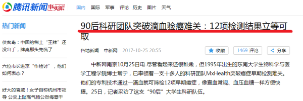 2017年,在教育部举办的第三届中国“互联网+”大学生创新创业大赛中,东南大学学生团队研发的癌症早期精准检测仪器获奖,但是被媒体炒作为“滴血验癌”,还出现了《90后科研团队突破滴血验癌难关:12项检测结果立等可取》类似的新闻。