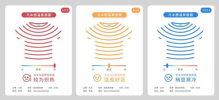 比如在婴幼儿领域中,凡米科技通过缝制于衣服夹层的“凡米感温芯”,可以智能检测宝宝的体温,并传输到手机端,如果宝宝发烧情况就会有高温报警,实现普通衣服的互联网智能化。目前,凡米已与一些国内头部品牌合作推出智能衣服(因协议要求,具体公司名暂不透露)。