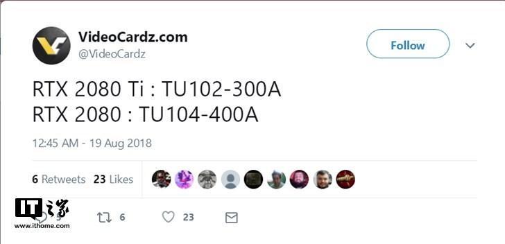 IT之家8月19日消息 NV将会在8月21日0点举办发布会,届时发布的显卡产品是RTX 2080以及RTX 2080 Ti,现在外媒曝光了这两款产品的具体芯片信号,从芯片型号来看,未来老黄似乎还有大招。