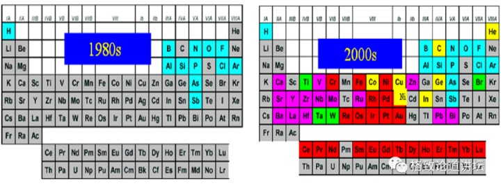 上世纪80年代,半导体材料只用到了门捷列夫元素周期表中蓝色标记的少量元素。新世纪之后,半导体材料的应用扩展了很多,大量的元素都被半导体用到。半导体的发展并不是简单的只用一种材料,而是会用到多种材料。所以,探索新型的半导体材料,成为今天晶体管发展的非常重要的技术路径。