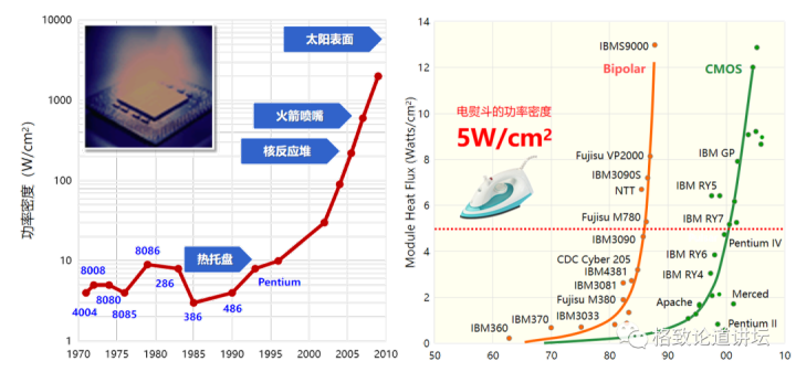 20世纪90年代预测的芯片功率密度的增长趋势(左)和功率密度的实际增长情况(右)