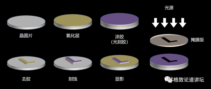 光刻工艺示意图这中间最重要的是光刻,光刻怎么做呢? 我们举个简单的例子。我们有个晶圆片,在晶圆片的上面做一个氧化层。氧化层可以帮助我们阻挡一些不该进入到硅片的东西。蒸了一层氧化层后,就要在氧化层上涂一层光刻胶。在光刻胶上方放置掩膜版。光源从上面照下来,把掩膜版上的图形映射到涂了光刻胶的硅片上。随后去做显影,去掉暴露在光线里的光刻胶,只留下阴影挡住的那一块,即图中的L形。然后做刻蚀,把下面的氧化层刻掉。最后去掉L形上面的胶,这时就有个L形停留在硅片上面,这就是光刻技术。这里我只简单展示了光刻技术中的七个步骤,如果加上清洗等环节,一层光刻过程可能包含十几个步骤。