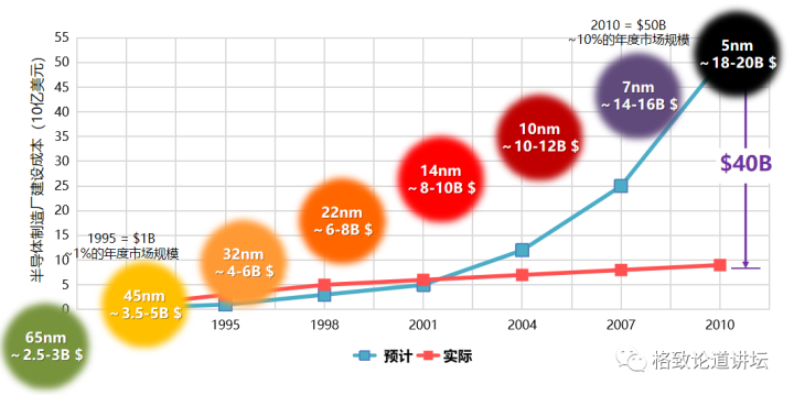在上世纪,我们估计到2010年时建一个集成电路厂大概要花500亿美元,相当于当年销售市场的10%,这是代价非常昂贵的事情。幸好科技的发展没有让我们失望,我们的实际开销大概是100亿美元左右,节省了400亿美元。即便如此,我们的花费仍然是一个天文数字。 例如,在65纳米时,达到的盈亏平衡要投25-30亿美元。在14纳米时,我们花费的100多亿美元就达到了美国一个核动力航母打击群的建造费用。到7纳米时,我们要花费140-160亿美元。到5纳米时,大概要花将近200亿美元。大家可能会疑惑,如此高昂的造价,我们是建一个核动力航母打击群,还是建一个集成电路制造厂?这是我们经常被问到的一个问题。如果建一个集成电路制造厂,后面还要继续投入,所以集成电路厂的建造非常昂贵。正是因为建造成本的高昂,使得芯片也在慢慢变贵起来了。