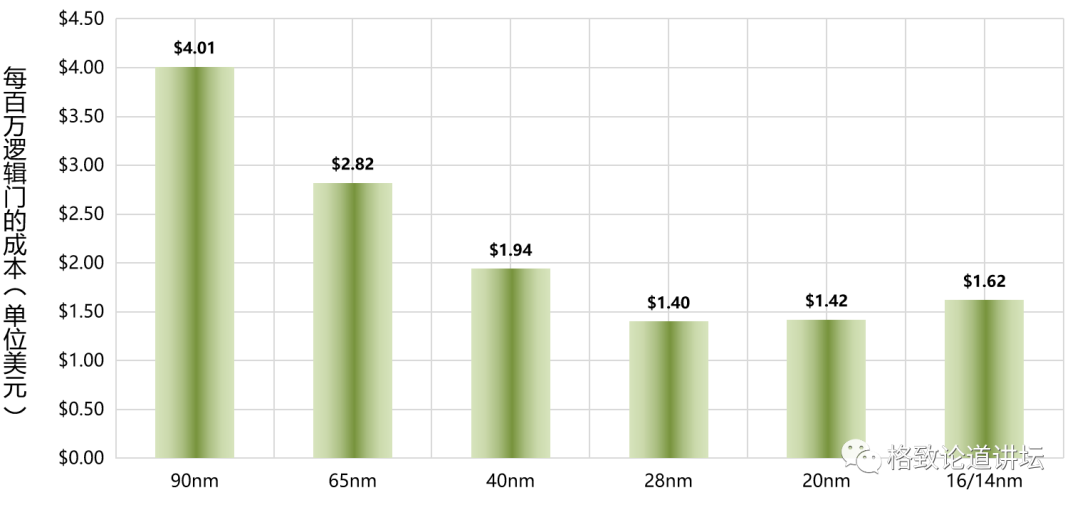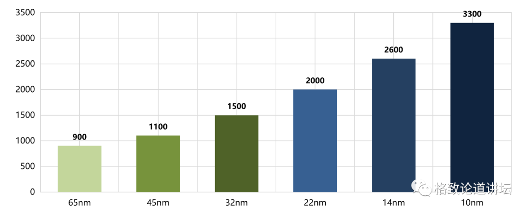在28纳米之前,半导体的价格一直在走下行的通道,所以前几年会感觉手机价格很便宜,我们经常隔半年就换一部手机。但是,这两年一部手机高达几千块钱,可能很少有人频繁地换手机了,这部分是因为芯片价格的上涨导致手机越来越贵。 我们按照百万逻辑门,即400万个晶体管,作为一个基本单位计算芯片价格。在28纳米时,它是1.4美元;到16-14纳米时,它是1.62美元,价格已经开始上升;现在到5纳米时,它的价格上升很快。所以今后半导体不会很便宜,电子产品也不会很便宜,这是生产规律所决定的。