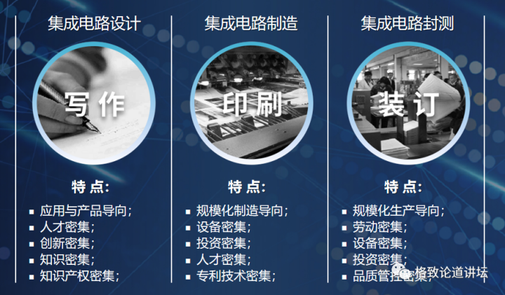 集成电路的设计相当于一个作家在写作,它是一个创作的过程,是一个知识产权密集的过程,也是一个人才密集的过程。作家写作完成之后需要印刷。这个印刷厂需要进行非常精密的印刷,字印得很小又很清晰,还能成千上百地印刷,中间不走样。这就相当于集成电路的制造。它是规模化制造导向、设备密集、投资密集和专利密集的产业。书本印刷之后需要装订,避免书本散架,装订过程中需要用到的材料还要防止磨损。装订也是一个非常重要的工作,需要检查装订是否正确、整齐,这就相当于集成电路的封测。因此,写作、印刷、装订基本上对应了设计、制造、封测。