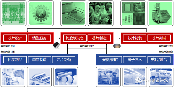 通常我们讲集成电路主要是指设计、制造和封测。 最近几年情况发生变化,我们把材料和装备也纳入集成电路的范畴。很多人可能不了解什么叫设计、制造和封测,我用一个简单的例子来类比,虽然不是很准确,但是我们可以大概理解其中的内容。