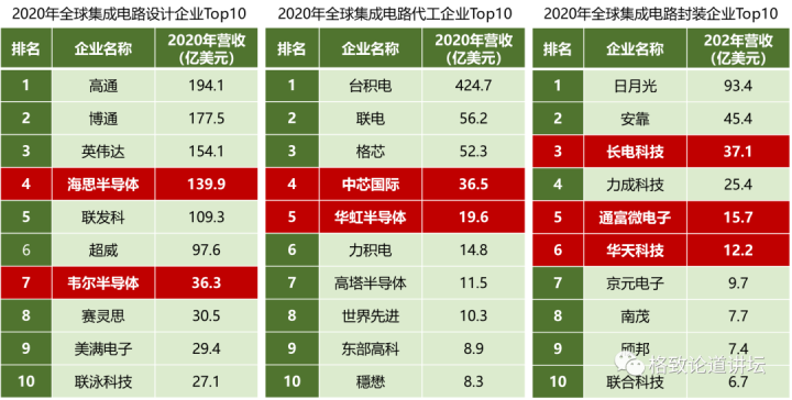 中国的企业进步也很快,我们在芯片设计、制造和封测都有企业进入了相关领域的前十位。设计企业有两家,代工企业有两家,封测企业有三家。