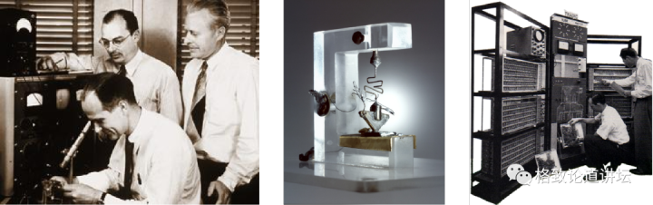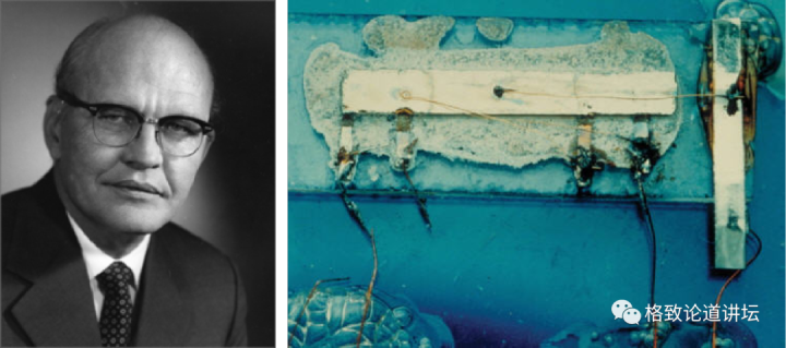 晶体管发明人肖克利(W. Shockley)、巴丁(J. Bardeen)和布莱坦(W. Brattain)(左),晶体管原型(中)以及世界上第一台晶体管计算机TRADIC(右)