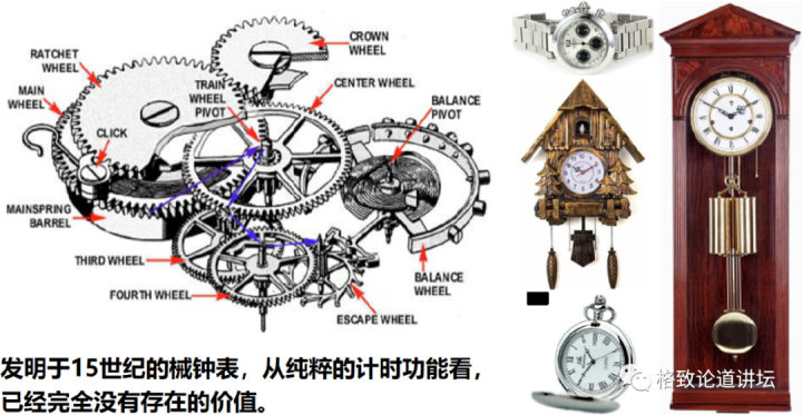 第二个是机械钟表的消失。 我们很多人都不会戴机械手表,而是选择电子表,甚至可能连电子表都不戴,拿一个手机就可以看时间了。发明于15世纪的机械钟表,从纯粹的计时功能来看已经没有存在的必要。像电子表的电子计时的功能,早在上世纪的1971年就被发明出来了,“杀死”机械钟表的也是芯片。