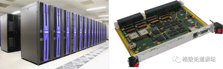 整机机柜(左)和电路板上的集成电路(右)