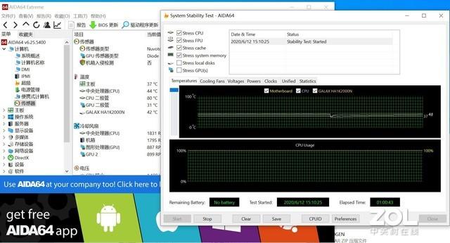 最后我们进行拷机的测试,使用AIDA64这款软件进行FPU和CPU双拷,看一看高负载时华硕 ROG STRIX B550-F GAMING (WI-FI)能不能顶住锐龙7 3700X这款8核心16线程处理器的压力。