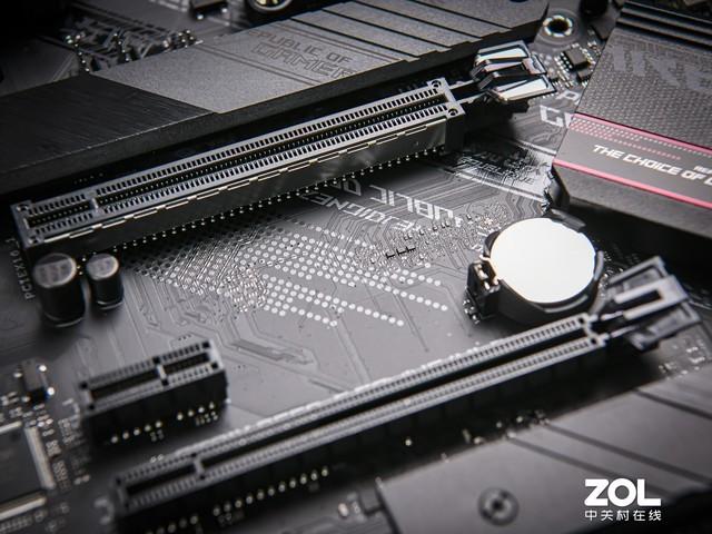 显卡插槽方面,华硕 ROG STRIX B550-F GAMING (WI-FI)提供了2根PCIe x16长插槽,使用了SafeSlot高强度安全插槽设计,金属保护装甲可以有效防止显卡插拔意外造成损坏。