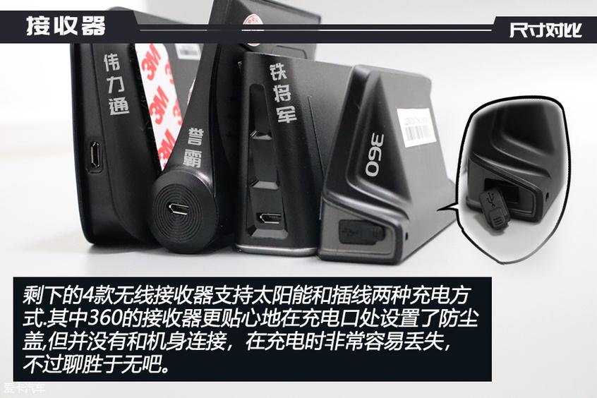 对比四款无线接收器的机身尺寸,360的体积最小,且造型更胜一筹;伟力通接收器的体积最大。然而我们不能一味追求机身体积最小,同时还要考虑屏幕大小、屏幕显示、字体等是否易于驾驶者查看。