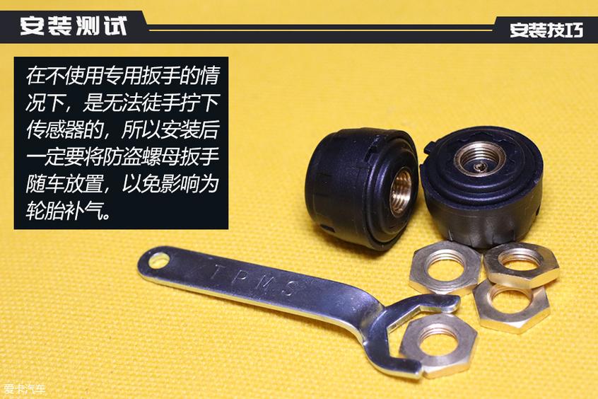 先将胎压监测附带的防盗螺母拧入,然后将传感器拧紧,随后用防盗螺丝扳手紧固螺母即可锁住传感器拧下的螺口。