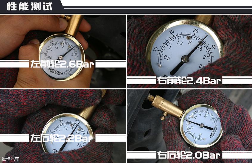 测试前我们对车辆四轮的胎压进行了标定,为了验证胎压监测器的精准度,我们把四轮的气压分别设定为不同的数值。胎压监测器准确监测出不同的胎压值要比四个车轮气压相同时更有难度。