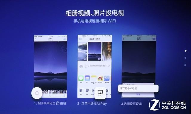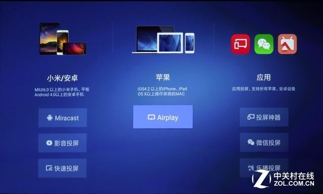 艾洛维Me2c智能微投的无限投屏也非常简单,系统内有关于不同操作系统的详细投屏介绍。苹果用户只需要将手机和微投连接在同一局域网内,然后在AirPlay中选择投屏设备即可完成操作。安卓用户则需要在设置中找到更多连接方式,然后选择设备即可完成投屏。这些操作都不需要下载任何app就可以快速完成。综合来看,本机的智能系统UI设计简洁、影视资源丰富,可以为用户带来很好的使用体验。