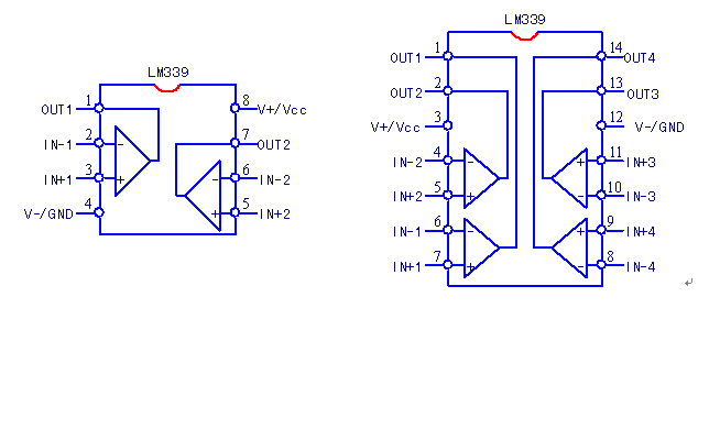8脚(双比较器)的引脚排列同8脚运放器件是相同的。14脚略有不同,输出端集中在1、2、13、14脚,供电端为3、12脚。剩余脚为输入脚,奇数脚为同相输入端,偶然脚为反相输入端。其引脚功能是不难记忆的。