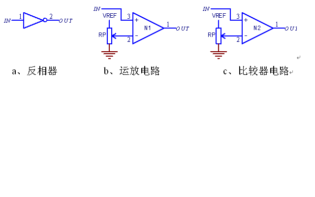 从常规符号(图1-3中a图)看,电压比较器也为三端元件,即两输入端,一输出端。其输入、输出的关系为: