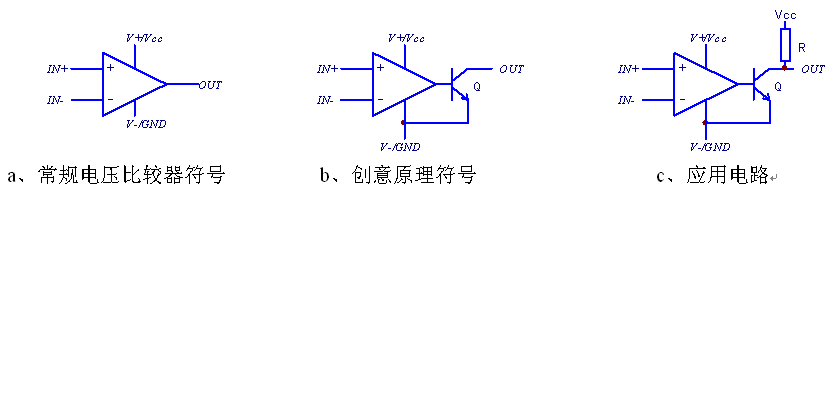 图1-3 常规电压比较器符号、创意原理符号与应用电路