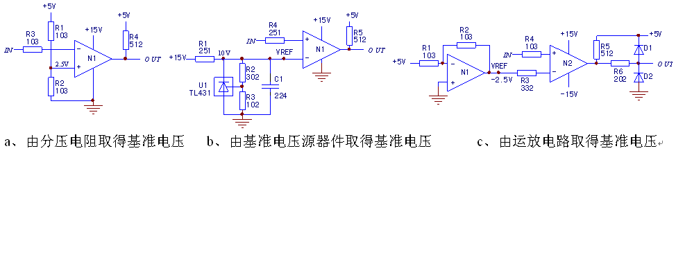 如上图1-5所示,基准(比较)电压可由供电电源经电阻分压取得;亦可由基准电压源或三端稳压器取得更为精准的基准电压;图1-5中的c电路,是由运放N1取得-2.5V基准电压后,送入电压比较器N2的反相输入端做为比较基准的。