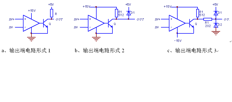 从应用电路(图1-3中c图)看,当当IN+> IN-时,内部Q截止,OUT端变为高电平。此时输出端高电平的幅度完全取决于上拉Vcc的电平幅度。如Vcc为+5V,电路输出高电平则为+5V;如Vcc为+15V,电路输出高电平则为+15V。