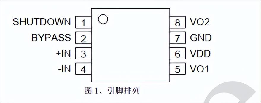 对于功率放大器,电源旁路电容的设计影响到噪声抑制和电源抑制比。典型运用中,推荐使用一个 10μF 和一个 0.1μF 的电容并联。 旁路电容尽量靠近芯片电源引脚。
