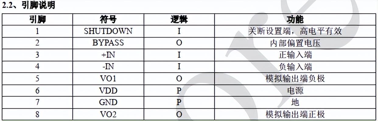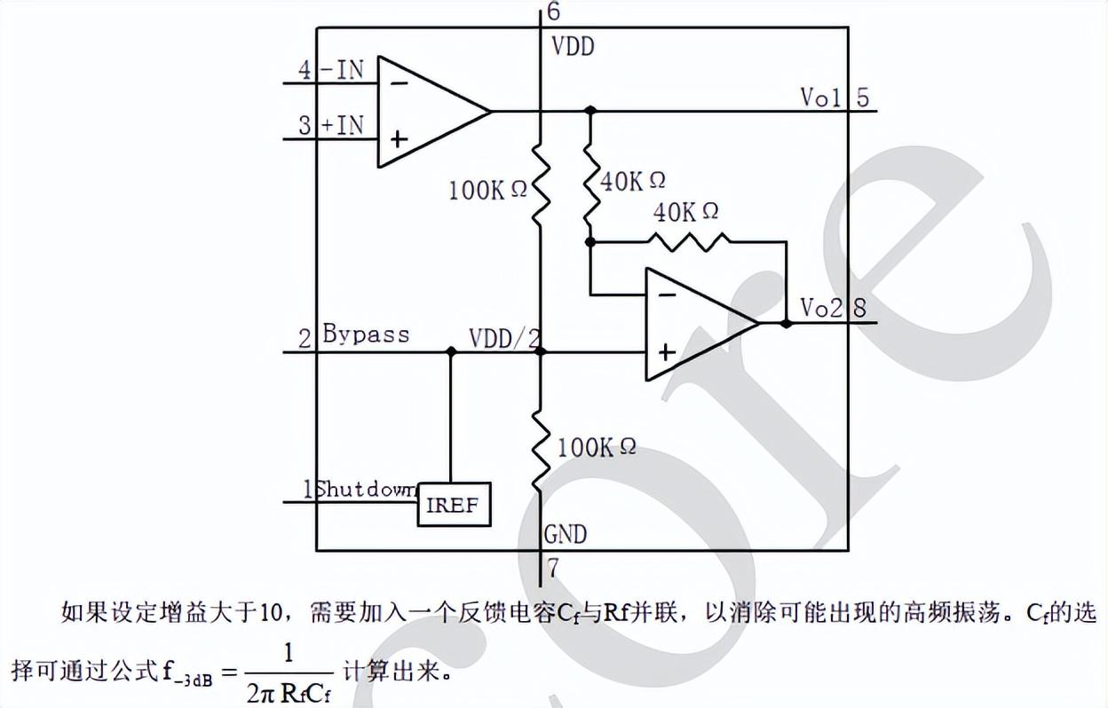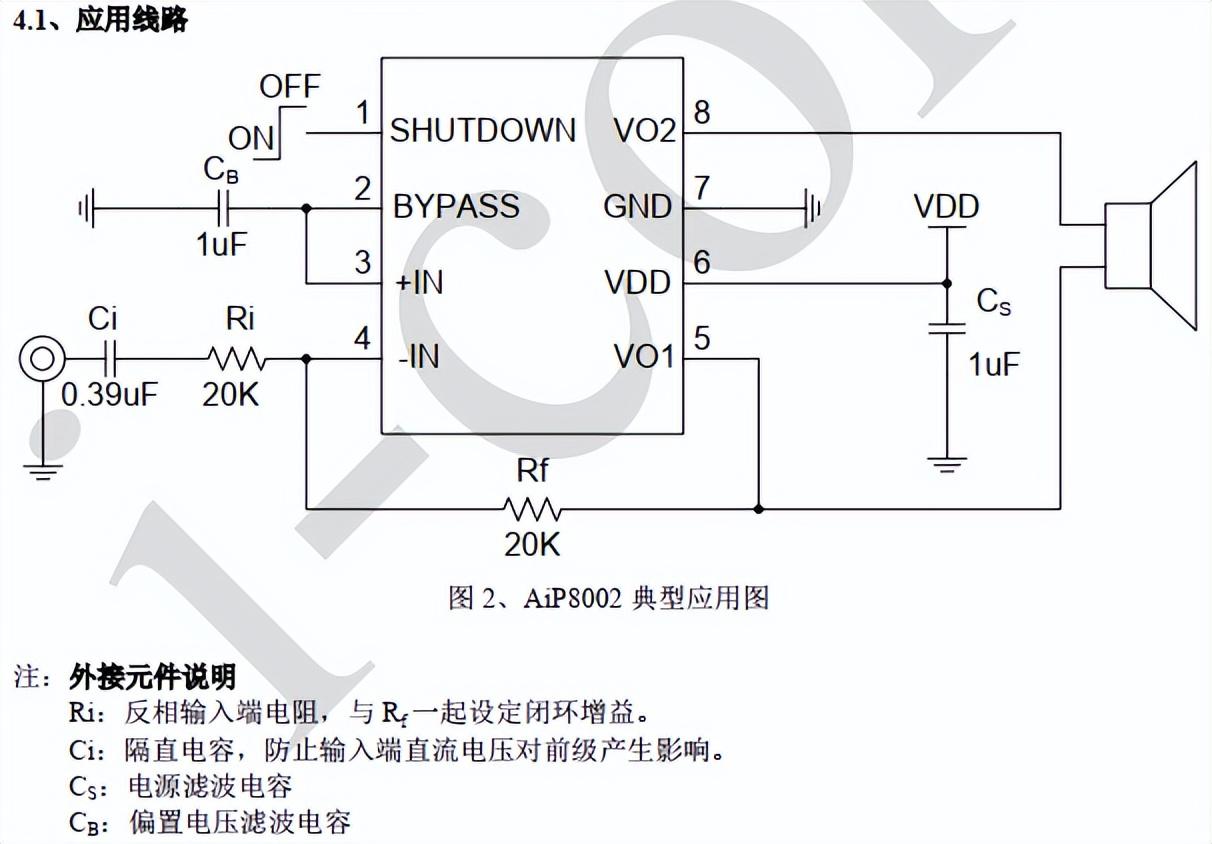 AiP8002功能框图如下: 内部有两个运算放大器,第一个放大器的增益可以通过外部设置,第二个放大器为内部固定增益。 通过输入电阻Ri的选择,可设定放大器的增益: AVD=2(Rf/RI)。