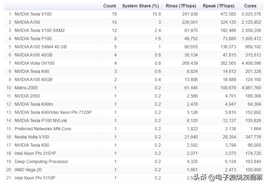 另一个是,近些年来,异构计算在超级计算机中使用越来越多,且大多数采用了NVIDIA的GPU或英特尔基于X86的Xeon Phi作为协处理器。在今年的TOP500中,共有145个系统采用了加速器/协同处理器技术,与第56版的147个相比,有所下降。其中有96个系统使用了NVIDIA Volta芯片,26个使用了NVIDIA Ampere芯片,9个使用了NVIDIA Pascal系统。
