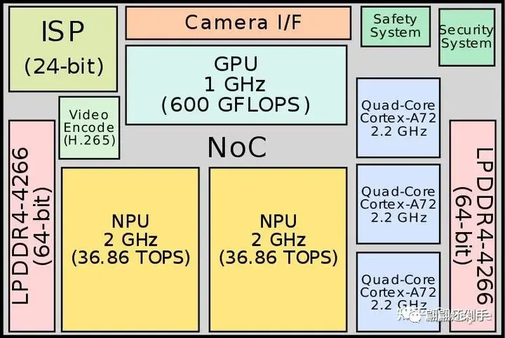 上图为特斯拉自动驾驶芯片架构,占很大一部分面积的是处理神经网络的NPU。