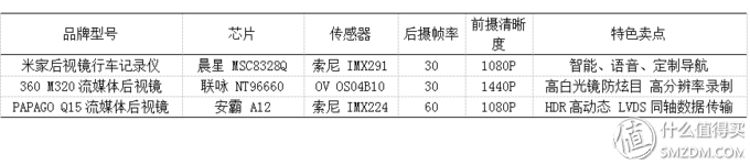 由于三款产品采用了三个厂家的芯片,因此我们一时间还不好直接对比其性能。但是通过帧率,传感器以及清晰度等参数,我们不难看出,对于PAPAGO Q15 来说,其主打的是稳定性、夜视能力以及高帧率 ;360 M320主打高分辨率录制 ;而米家后视镜行车记录仪 ,同样具备一颗夜视能力很强大的传感器,比较注重夜视能力 ,但是很可惜,其后摄需要另行购置。