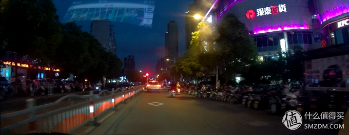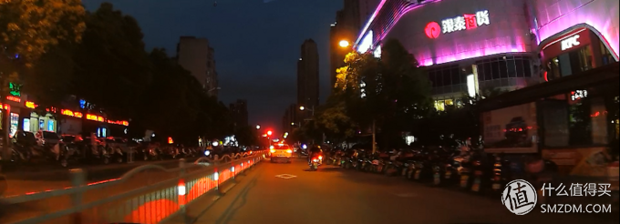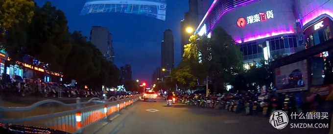 在夜间,PAPAGO N291记录的画面在亮度优势上进一步扩大(右侧一排非机动车对比尤为明显),但是“银泰百货”四个字稍显“过曝”;70迈 Pro 记录的画面相对中正,无功无过;米家 1s稍处下风。
