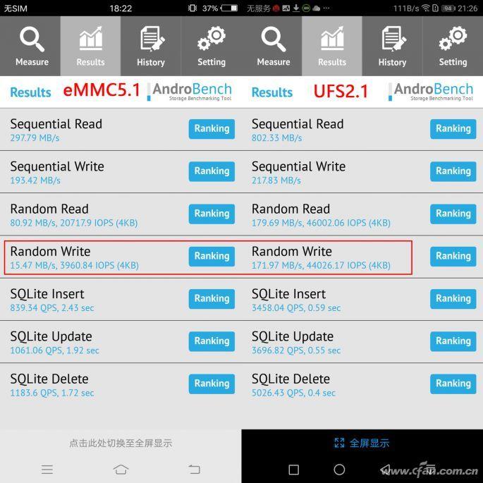 需要注意的是,虽然UFS 2.1相较eMMC 5.1在持续读取速度上实现了2.5倍左右的提升,但持续写入速度却没有太大变化(200MB/s左右)。但是,如果我们仔细留意4K写入速度一项,就会发现UFS 2.1的实测速度能领先eMMC 5.1十倍有余,这对于下载提速可有着更加实际的意义。