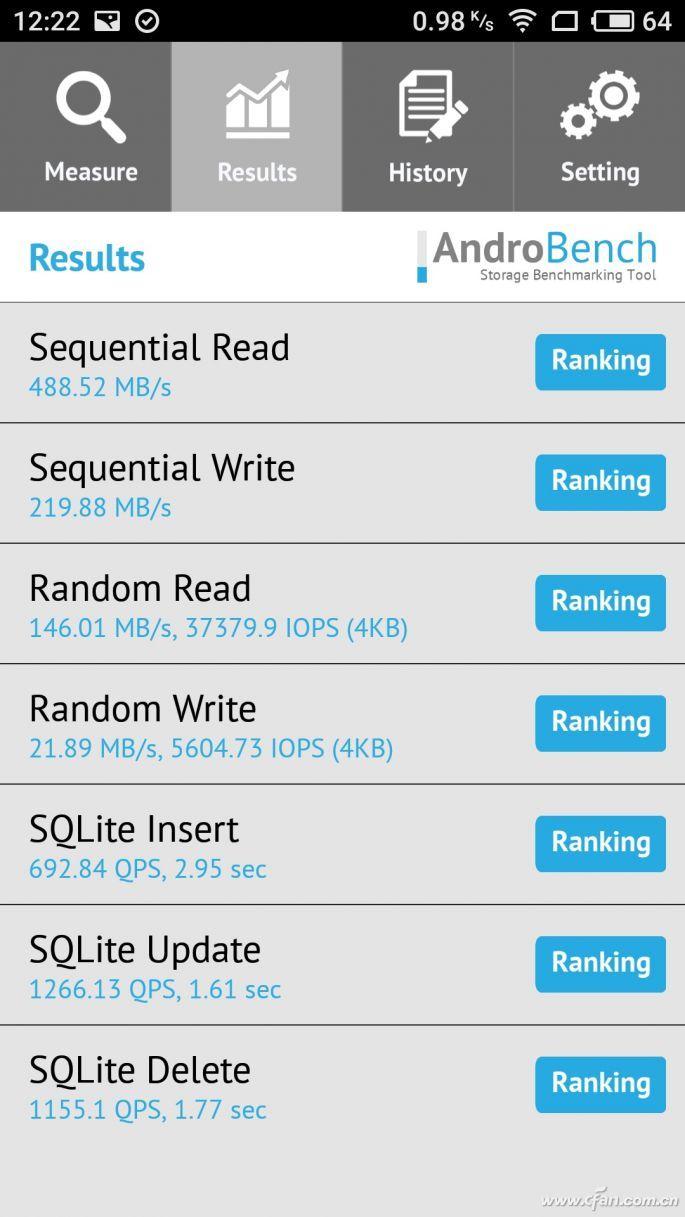 如果你想知道手机闪存的具体性能,则可下载安装名为AndroBench的测试软件,如果测试结果的持续读取速度在700MB/s以上,那就说明手机闪存版本为双通道的UFS2.1,代表当前的顶级存储性能。如果速度在500MB/s左右,那就是运行在双通道模式UFS2.0或单通道下的UFS2.1。