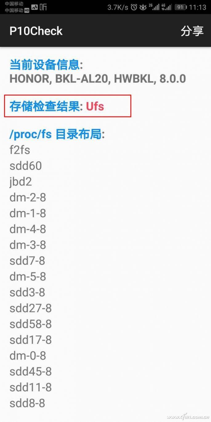 在网上搜索下载名为“P10Check”的应用,安装运行后就能自动反馈出手机的闪存标准到底是eMMC还是UFS,可惜该软件无法进一步细分UFS的版本(如UFS2.0还是UFS2.1)。