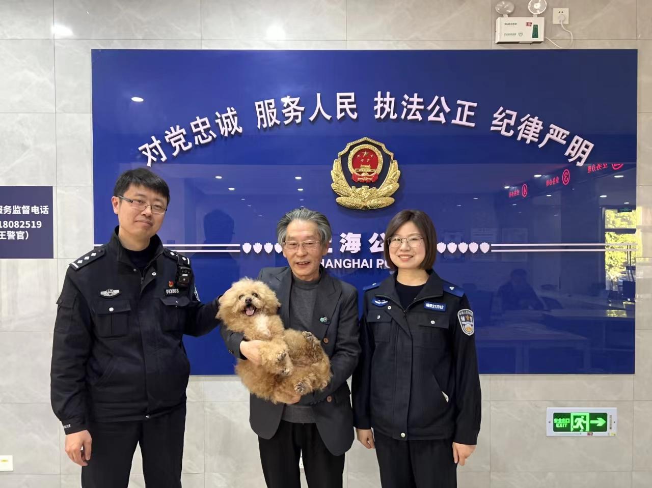 4月9日下午,来自上海市宝山区的张先生,抱着失而复得的爱犬对梅陇派出所民警连连道谢。