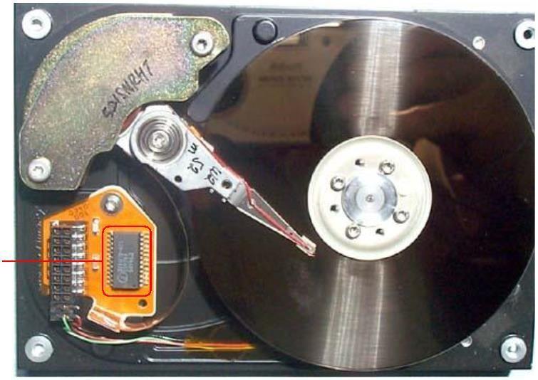 磁头芯片贴装在磁头组件上,用于放大磁头信号、磁头逻辑分配、处理音圈电机反馈信