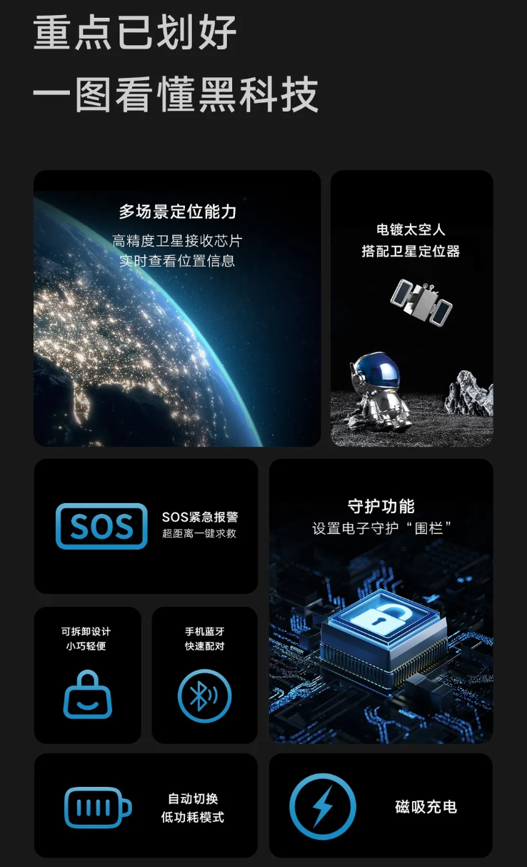 该穿戴智能设备采用可拆卸设计 ,支持 SOS 紧急报警 、手机蓝牙配对 、电子守护“围栏” 等功能;同时设备支持磁吸充电 ,内置低功耗模式 (支持自动切换 )。