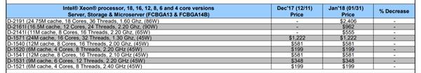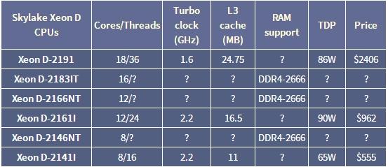 两款产品中间分别还有16核心的Xeon D-2183IT,12核心的D-2166NT和D-2161I。