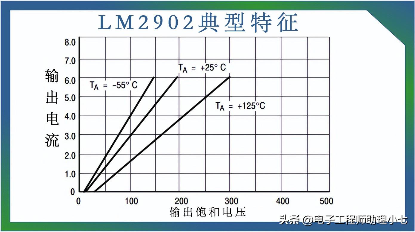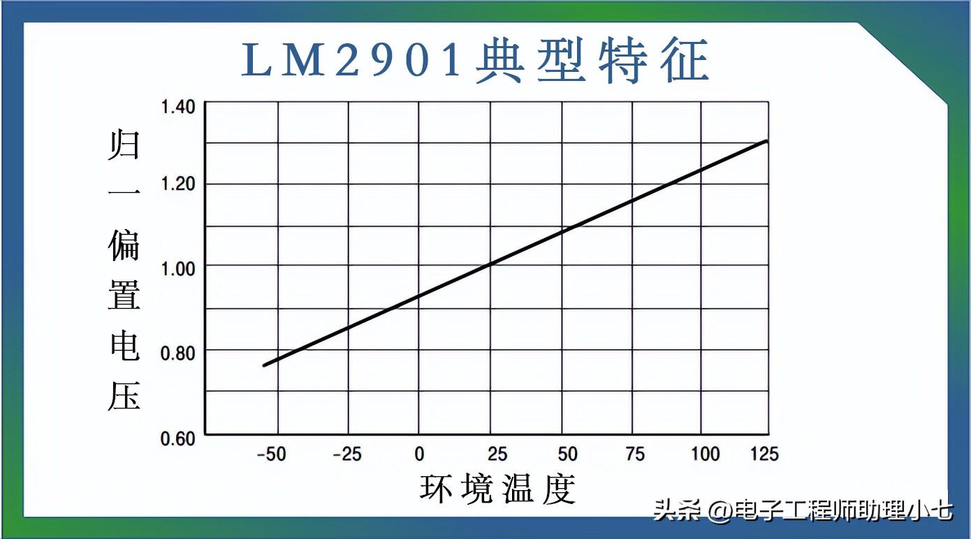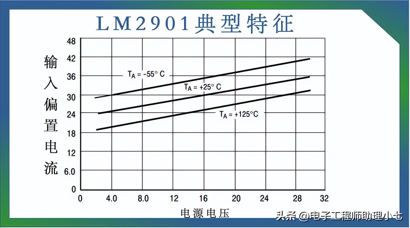 7、T低= -40°C, T高= +105℃8、在输出开关点,V O = 4 Vdc,R S ≤100 Ω 5.0 Vdc ≤ V CC ≤ 30 Vdc,输入在整个共模范围内(0 Vdc 至 V CC -1.5 Vdc)。9、由于 PNP 输入,偏置电流从输入流出 此电流实际上是恒定的,与输出状态无关。LM2901 特性参数