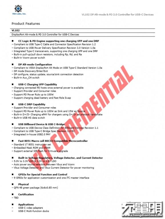 威盛VL102-Q4规格资料,我们不久前拆解的UNITEK优越者USB-C多功能扩展坞D026A也用到了这款芯片。