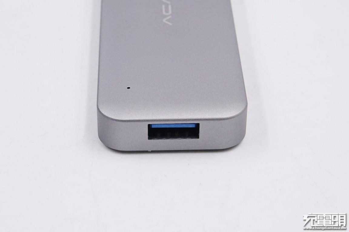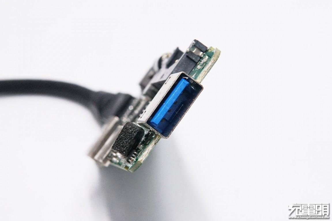 相邻侧面还有一个USB3.0接口,数据传输速度高达5Gb/s,顶面边角处有一颗工作指示灯。