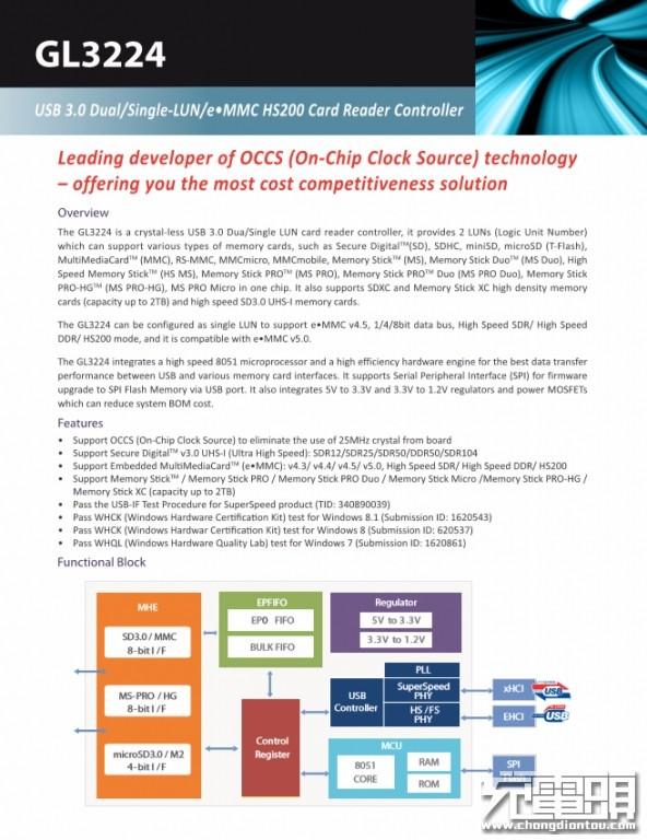 Genesys创惟GL3224,读卡器芯片,支持USB3.0,SD卡,TF卡,记忆棒的读写,还支持EMMC芯片。