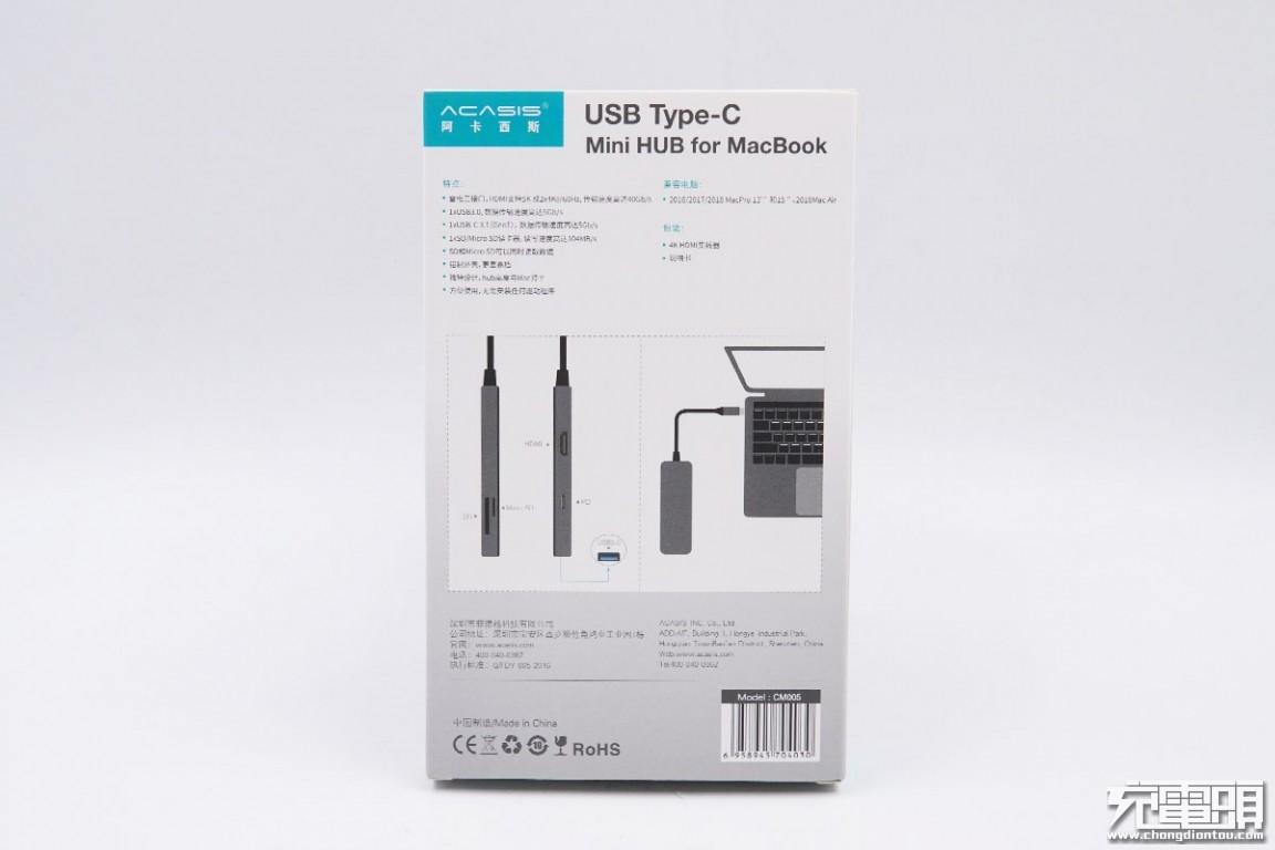 包装盒正面中间位置印有产品外观图,上端印有ACASIS阿卡西斯品牌和USB Type-C Mini HUB for MacBook,下端设计有产品六大特性标识和CM005型号。
