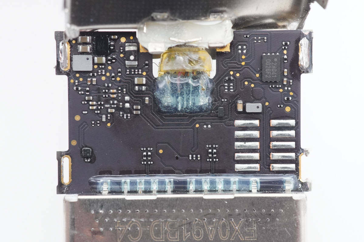 PCB其中一面焊接USB-C控制芯片和读卡器芯片,导线焊点和卡槽焊点涂胶加固。