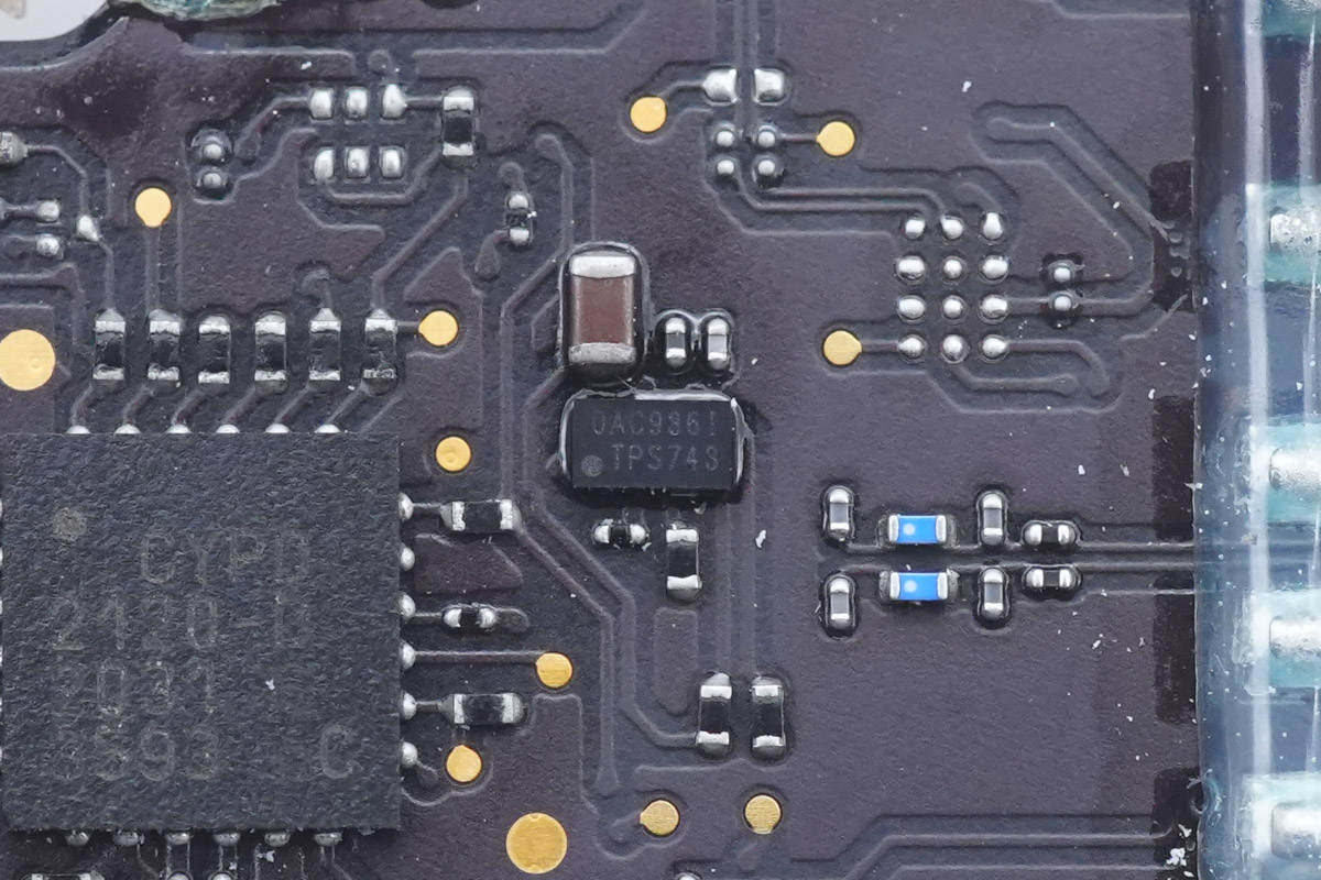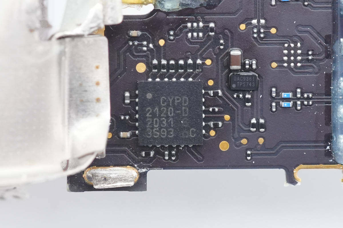 USB-C控制芯片来自英飞凌,型号CYPD2120,属于EZ-PD CCG2系列,为无源线缆、主动线缆和电源配件提供完整的USB-C和供电端口控制解决方案。芯片使用赛普拉斯专有的M0S8技术,内置32位M0处理器和32KB闪存,内部集成完整的Type-C收发器。