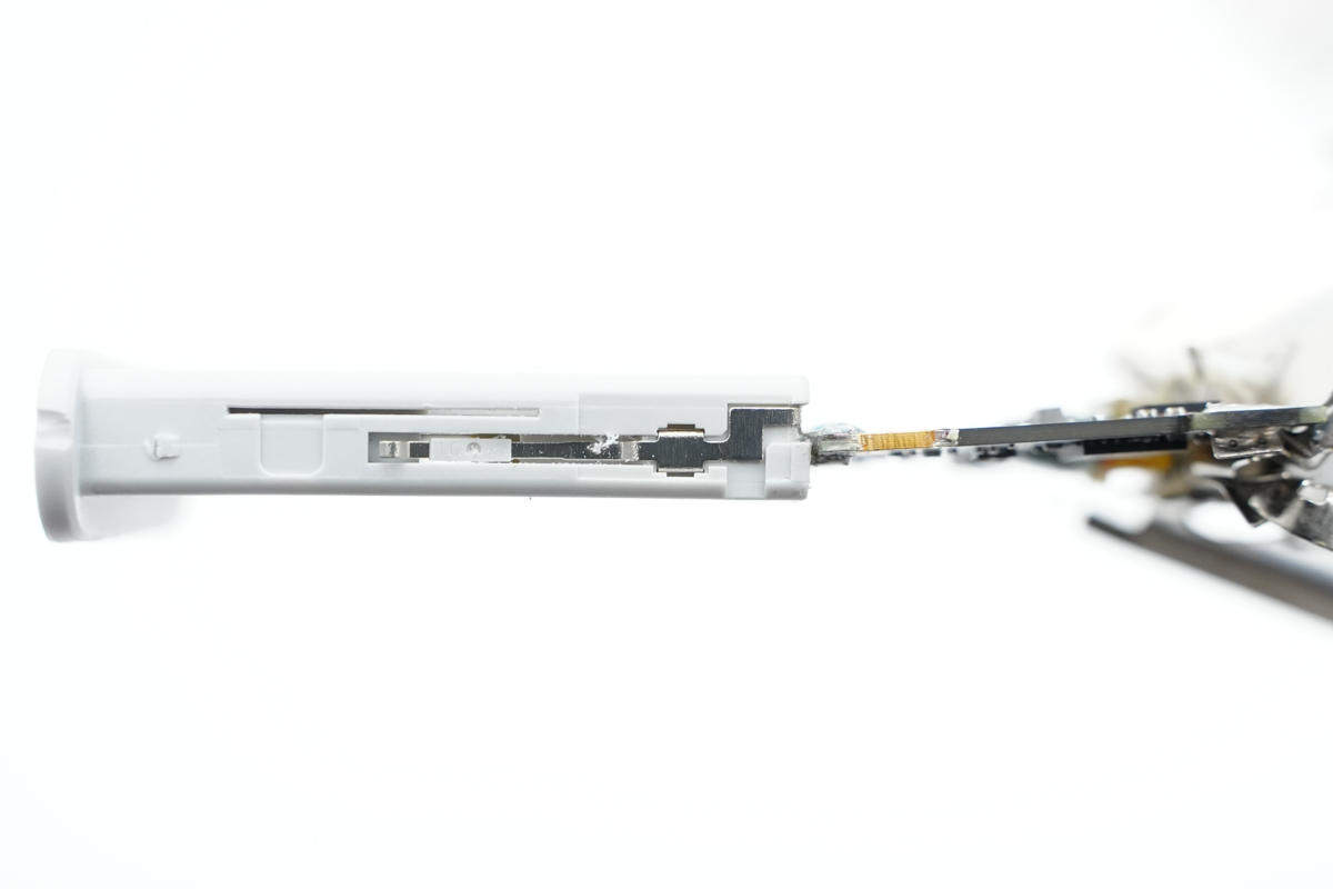 抽出外层的塑料支架,内部连接SD卡针脚的弹片特写。