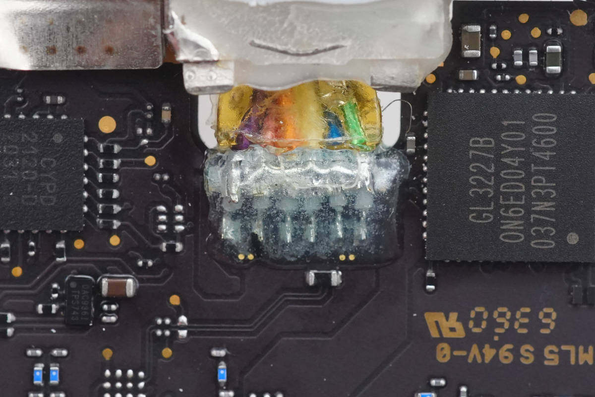 数据线焊接处特写,胶水固定。能够看到胶水下面为同轴线,屏蔽层统一接地焊接。