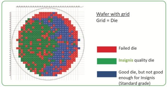 每一片硅晶圆制作完成之后,都会有专门的机器对蚀刻出来的每一个芯片进行测试,确定其稳定性如何,而这就将能看出其理论品质如何。根据品质,将芯片分为多个等级,优质的芯片一般被称为Good Die(下图绿色部分,和下图蓝色标识的good不是一个概念)将会被用来做成高品质的手机存储芯片(eMMC,UFS)以及SSD固态硬盘。